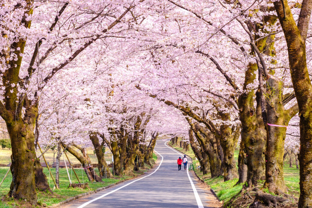 「さくら名所100選」にも選ばれているこの地では、市道の両側に約1,000本のソメイヨシノが約1.3kmにわたって咲き誇り、圧巻の「桜のトンネル」を作り出します。また、隣接する「みやぎ千本桜の森公園」では、15万株のシバザクラが地面を鮮やかに彩り、桜との競演が楽しめます。