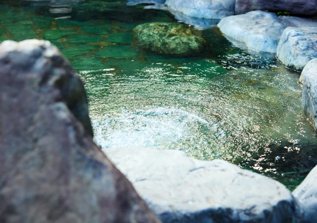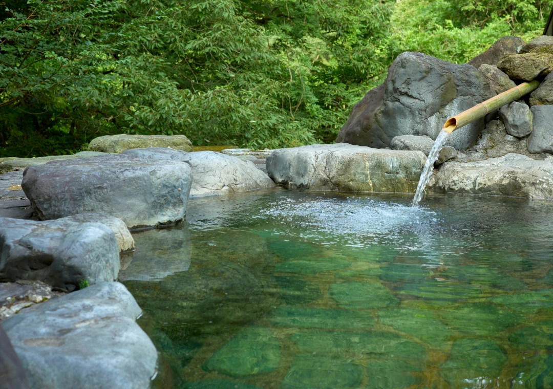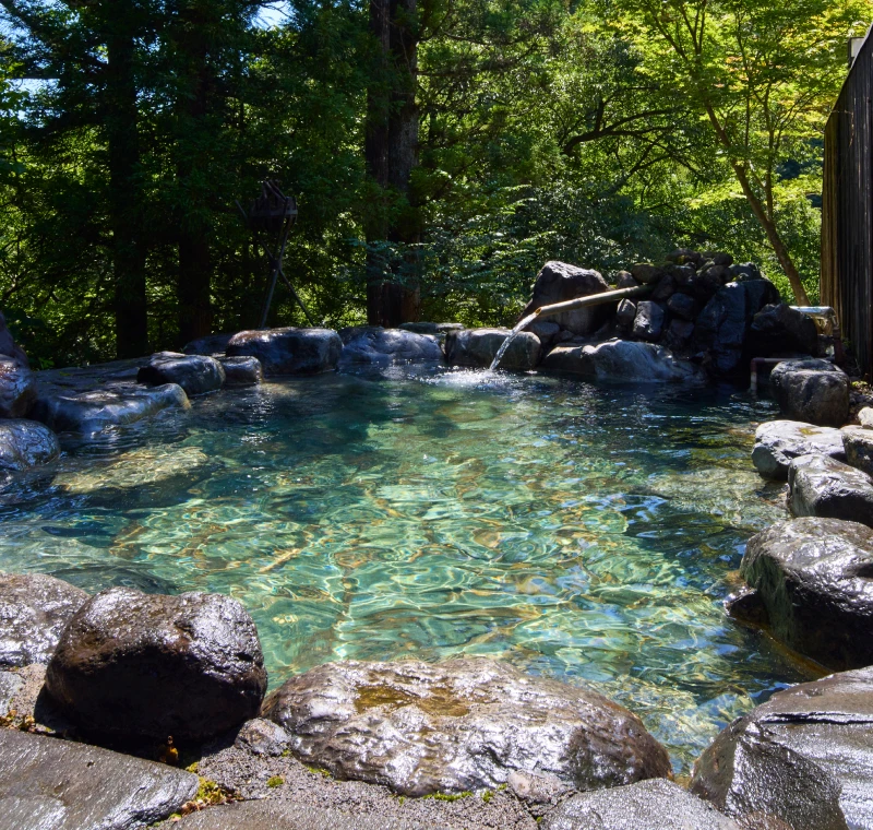 山々の緑に囲まれ、開放感あふれる広々とした岩造りの露天風呂。耳をすませば、ほど近く流れる滝のせせらぎが心地よく響きます。
