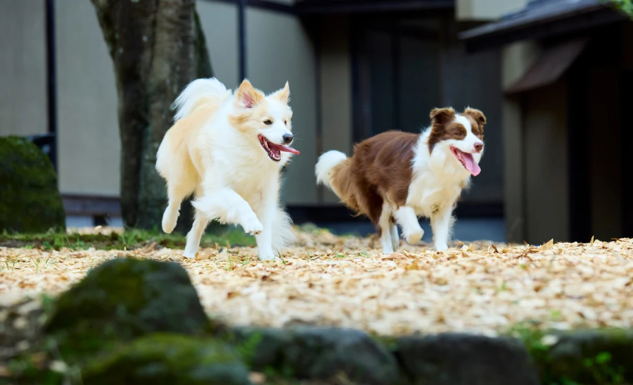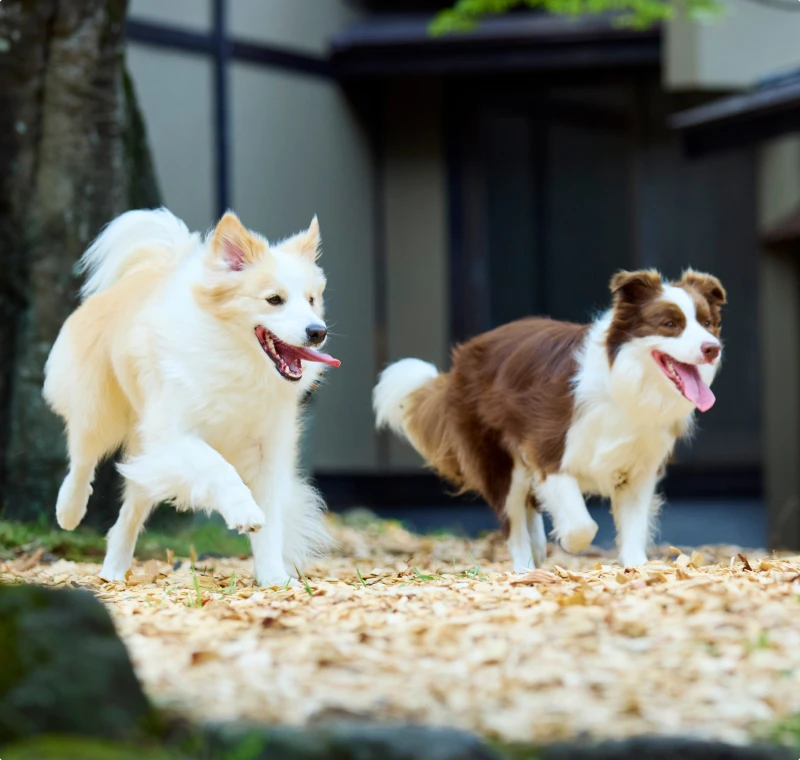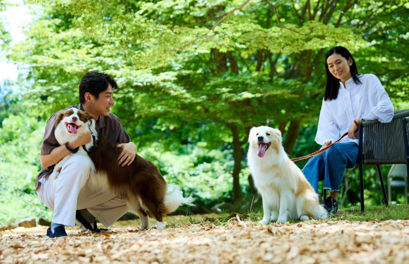 特別な思い出を\ \\\\\古民家調の落ち着いた空間や、自然に囲まれたウッドチップのドッグラン、ファイヤーピットなど、館内外に愛犬と楽しめる施設が充実。旅の思い出を彩ります。