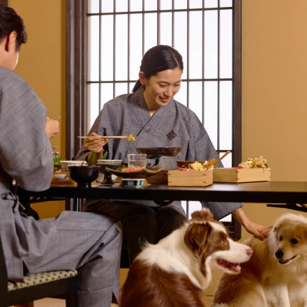 館内すべてのエリアで愛犬と一緒にお過ごしいただける設計となっておりますので、思い出に残る旅のひとときをお楽しみください。- \