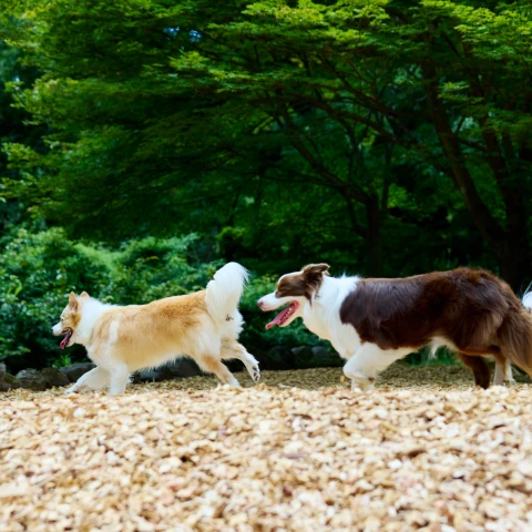 \\ 高低差のある山の地形を活かし、ウッドチップを敷き詰めた約250㎡の屋外ドッグランでは、ノーリードで思いきり走り回ることができます。出入口は二重扉で、安全面にも配慮しております。\