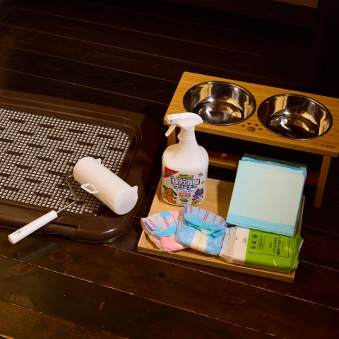 \ ウェットティッシュ/足拭きタオル/トイレシート/トイレトレー/マナーパンツ/消臭スプレー/エチケット袋/粘着ローラー/水飲み器/食器/リードフック\